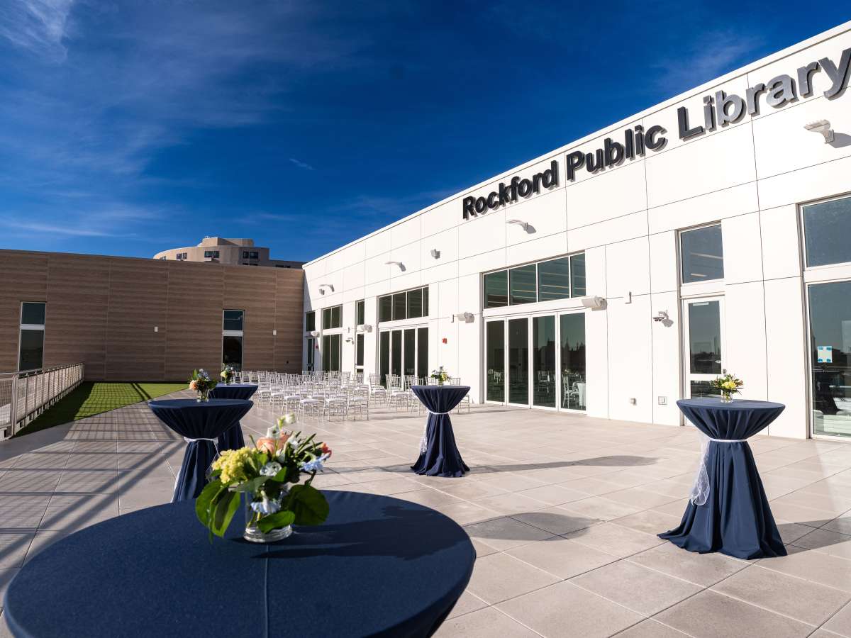 Host meetings or weddings at Rockford Public Library’s modern downtown venue, featuring a rooftop terrace, flexible event space, and convenient parking.