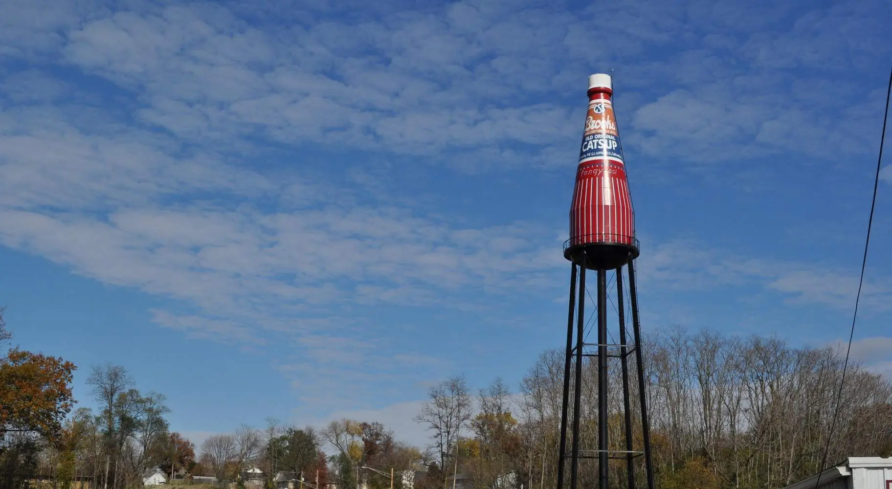 Nous pouvons affirmer avec certitude que vous n'avez jamais vu une bouteille de catsup aussi grande. Cette bouteille de 170 pieds de haut est debout depuis 75 ans. À l'origine, il s'agissait d'un château d'eau pour l'usine Brooks Tomato Products Company (fabricant du catsup le plus vendu aux États-Unis). Aujourd'hui, la tour est devenue une icône en soi, chantant les louanges d'un produit largement oublié, qu'elle ne quittera plus jamais.